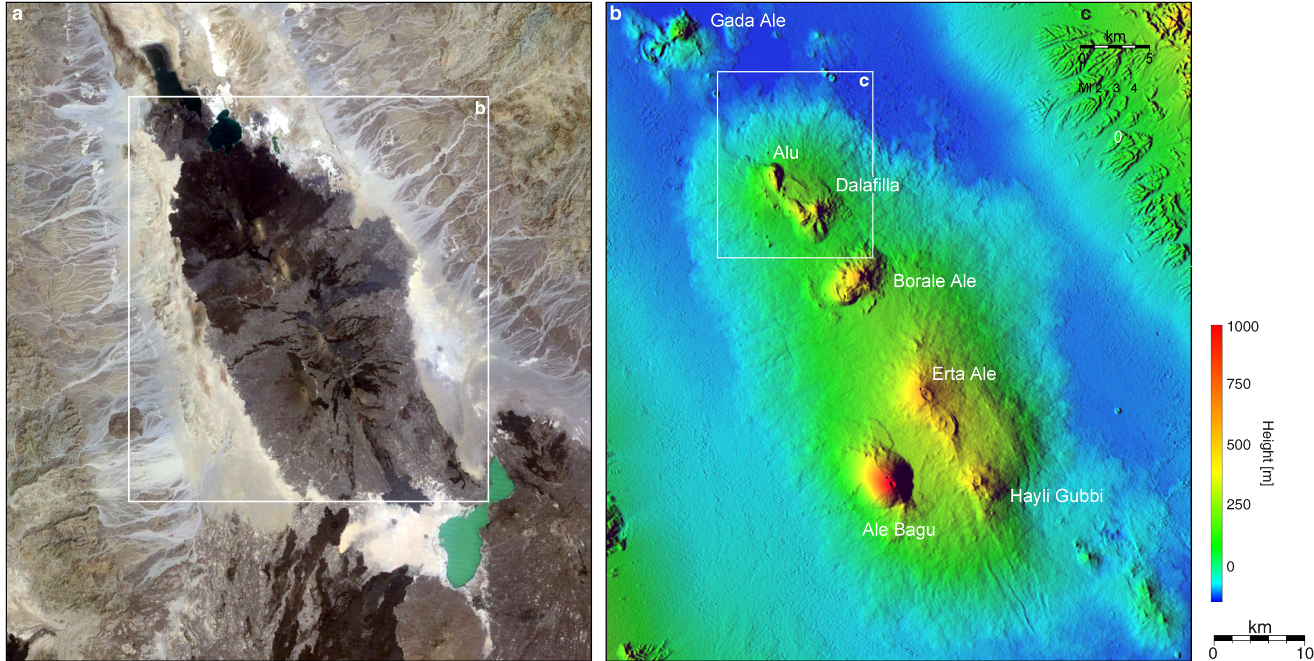 The final stages of break-up are exposed free of cover by seawater in the Afar depression, where Quaternary axial volcanic ranges like Erta Ale are believed to behave as subaerial mid-ocean ridges. Portions of the Afar depression have been shown to be characterised by subaerial magnetic stripes similar in pattern and amplitude to those that characterize seafloor spreading centers.