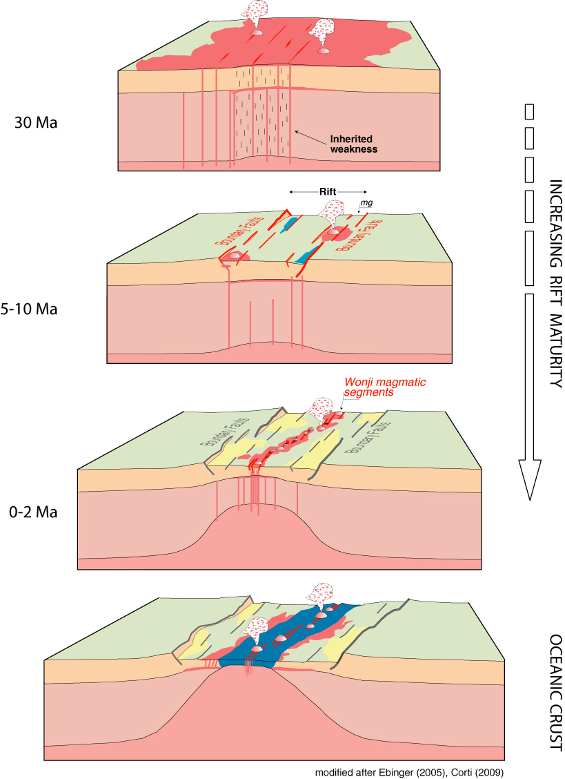 As soon as the volcano-tectonic activity was localised within the internal tectono-magmatic segments, a strong feedback between deformation and magmatism developed: the thinned lithosphere was strongly modified by the extensive magma intrusion and extension was facilitated and accommodated by a combination of magmatic intrusion, dyking and faulting. In these conditions, focused melt intrusion allows the rupture of the thick continental lithosphere and the magmatic segments act as incipient slow-spreading mid-ocean spreading centres sandwiched by continental lithosphere. Overall the above-described evolution documents a transition from fault-dominated rift morphology in the early stages of extension toward magma assisted-rifting during the final stages of continental break-up. A strong increase in coupling between deformation and magmatism with extension is documented, with magma intrusion and dyking playing a larger role than faulting in strain accommodation as rifting progresses to seafloor spreading.